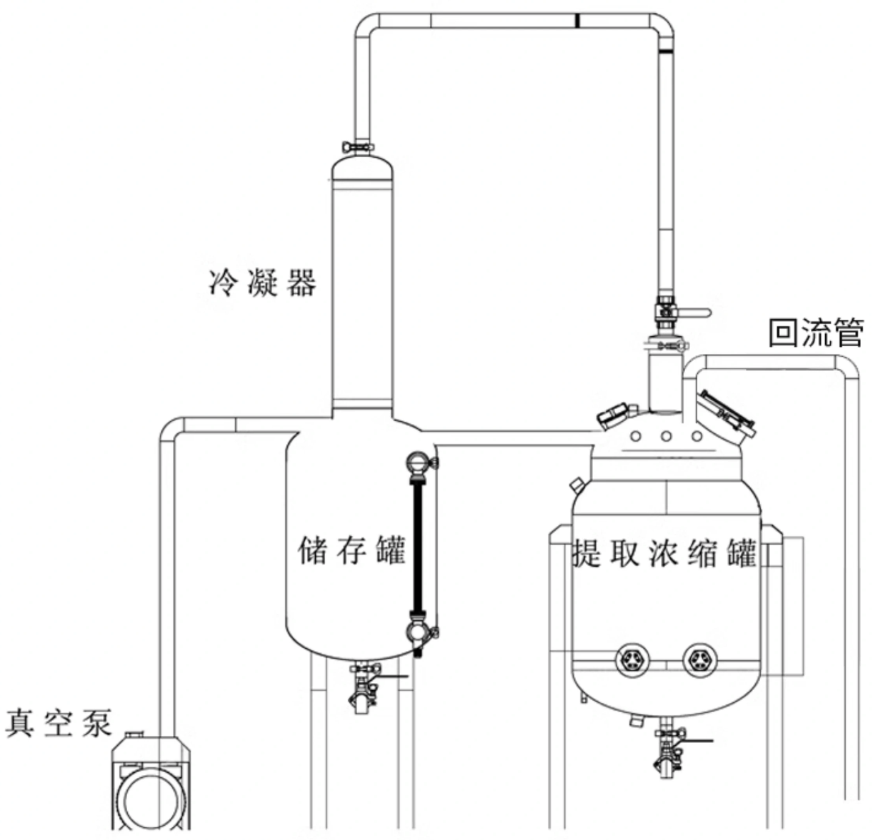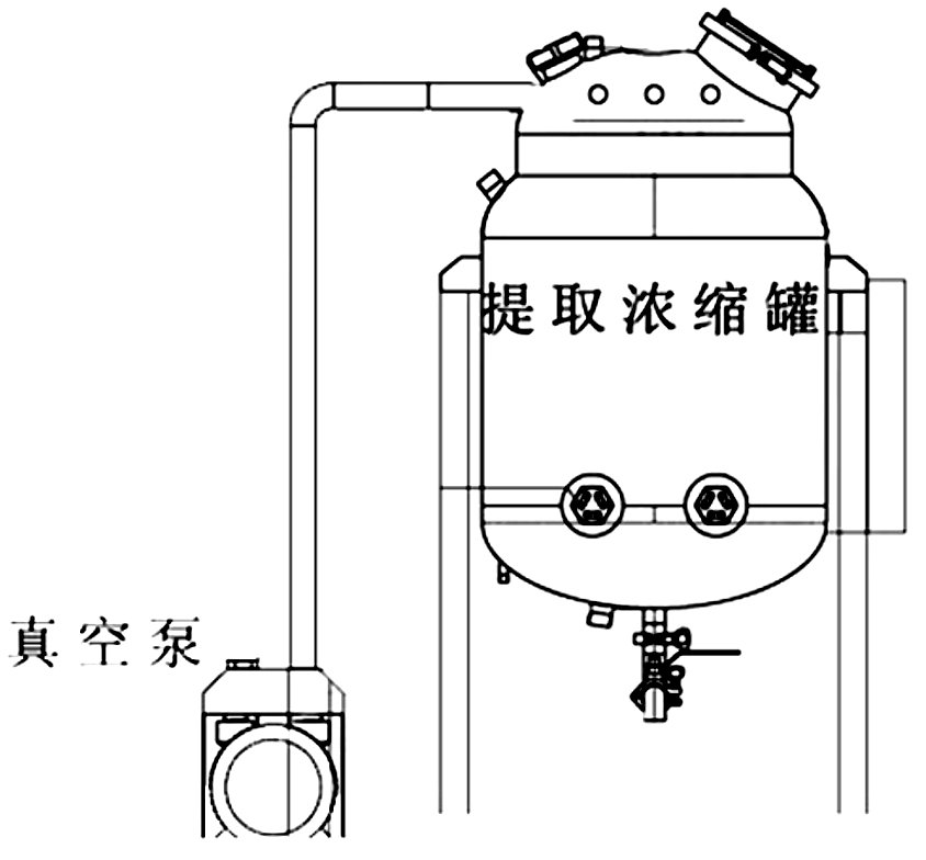 药材提取后放出提取液,倒出药渣,浓缩罐抽真空后经回流管回到