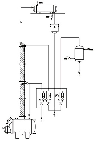 本装置采用高效不锈钢波纹填料,接触酒精部位,如塔体、冷凝器、稳压罐、冷却蛇等均采用优质不锈钢制作,成品酒精不被污染,塔釜采